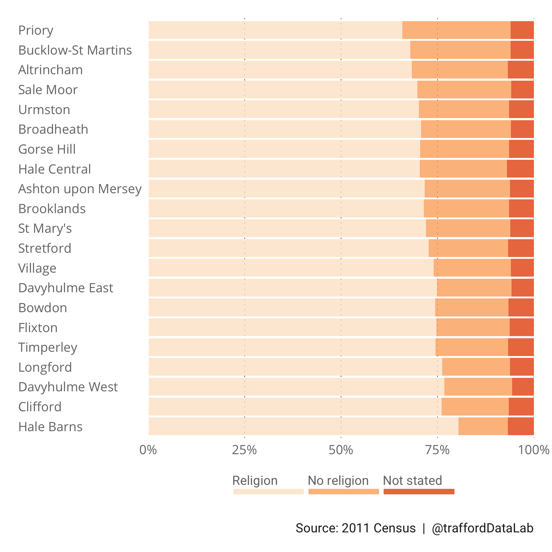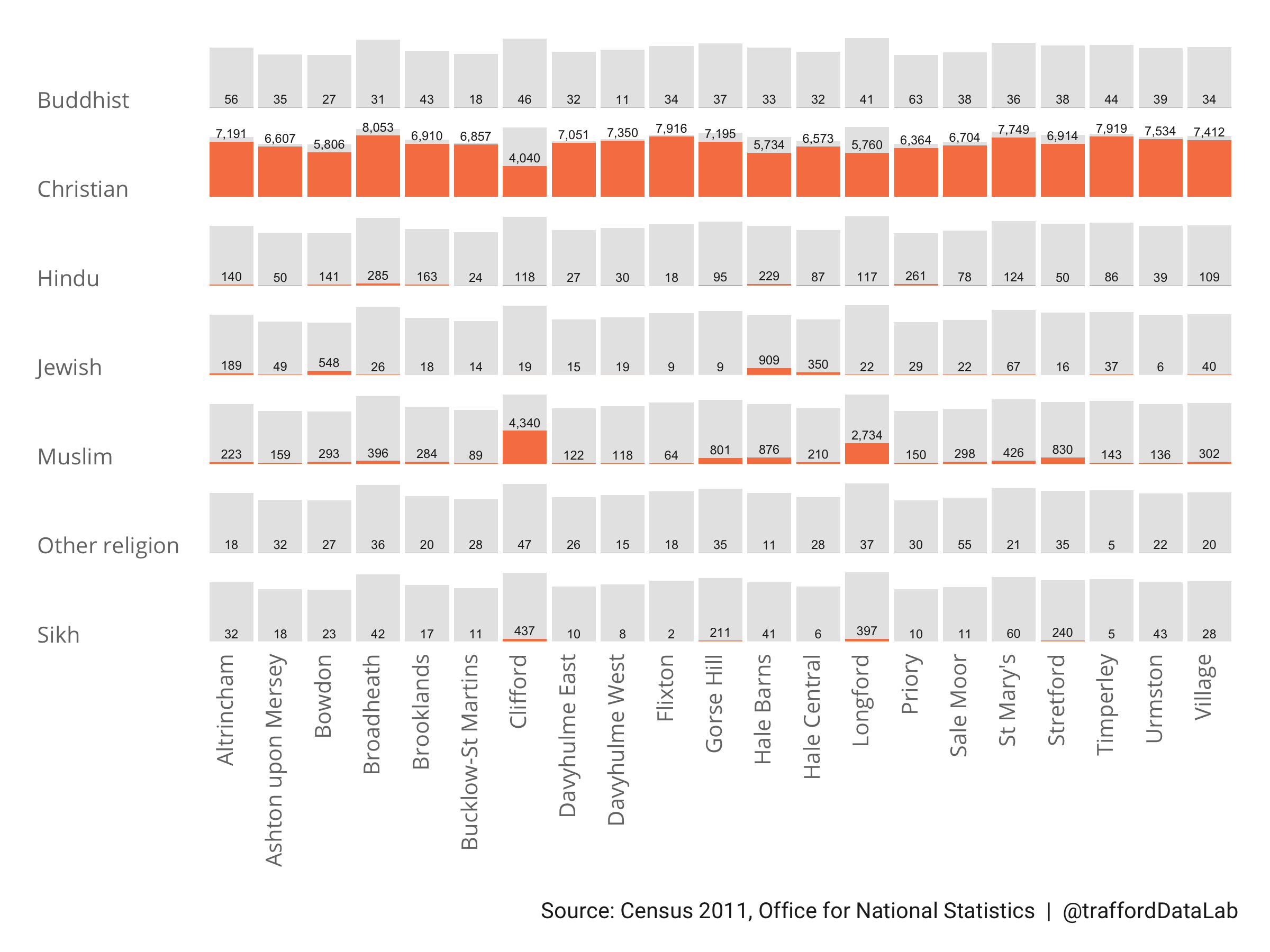 Figure 3 shows the count of residents in each ward by their religious affiliation. The grey background indicates the total number of ward residents who reported having a religion. The dominant religious group in all wards is Christian except for Clifford which has a slightly larger population of Muslims (48%). There is also a significant minority of Muslim residents in Longford ward (30.1%) and Jewish residents in Hale Barns (13.2%).